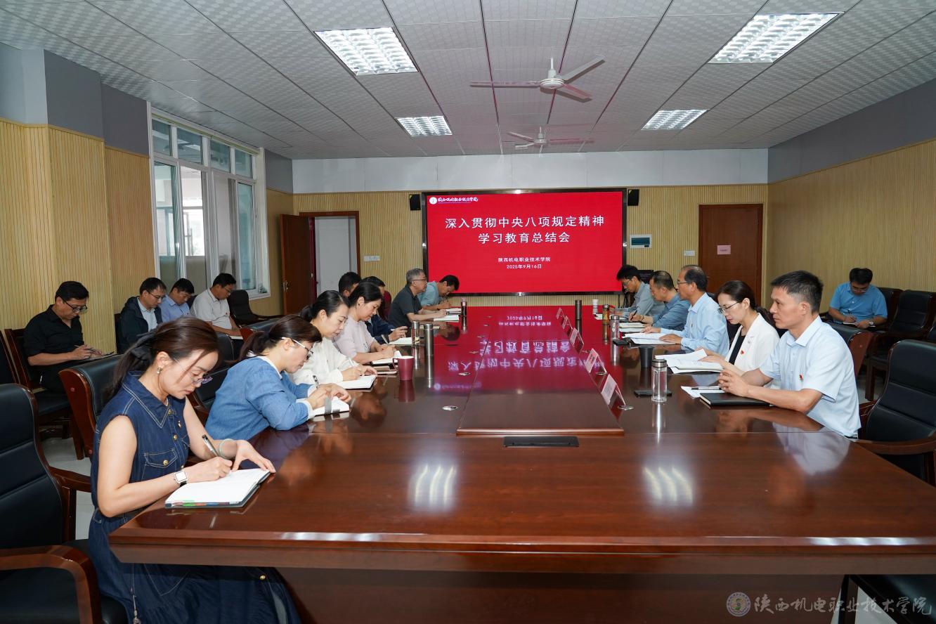 9月16日,陕西机电职业技术学院党委在蟠龙校区图书馆二楼会议室召开深入贯彻中央八项规定精神学习教育总结会,认真学习贯彻习近平总书记关于深入贯彻中央八项规定精神学习教育的重要指示精神,传达中央和省委党的建设工作领导小组会议精神,全面总结学校学习教育成效,部署下一步重点工作。党委书记伊逊智主持会议并讲话。